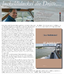 Auf ein Neues!, so hieß der nächste Titel, der kein halbes Jahr später kommen sollte und schon fix und fertig war. Seine "80 Tage von und bis Bonn" fielen jedoch noch der Zensur aus dem erweiterten Freundeskreis zum Opfer. Grundlos zwar, so aber wurde es eben ein Roman, über tragendes Wasser, Sonne und Regen, von Nussschalen im Wind und der Kraft, sich durch's Leben zu schippern. Das geht in einer kleinen Marina los, nennen wir sie Glückswerth. Da liegt auch das nette Holzboot, 10 Meter mit Kajüte, genau 34 Fuß, heiße es Juckeldiduckel. Schnell das MY für Motoryacht davor und beides auf den Umschlag. Der Eigner ist nun Mediziner, angestellter Chefarzt in der Voreifel, seine Frau steht mit eigener Praxis im Leben. Das spannt weiterhin den Bogen. Auch "der Roman" steht für alltägliches und Jedermann. Nur ist jetzt alles frei erfunden. Etwaige Übereinstimmungen mit tatsächlichen Begebenheiten wären also rein zufällig. Auch um das zu verstehen, muss man aber erst zuende lesen.